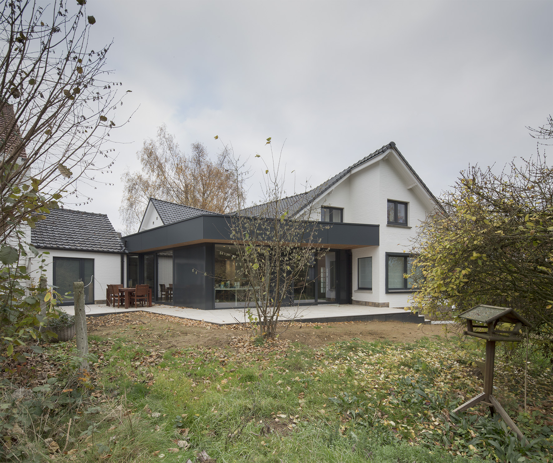 L’intervention consiste à relier la partie maison et la partie garage, par la création d’un espace de vie cuisine + salle-a-manger.