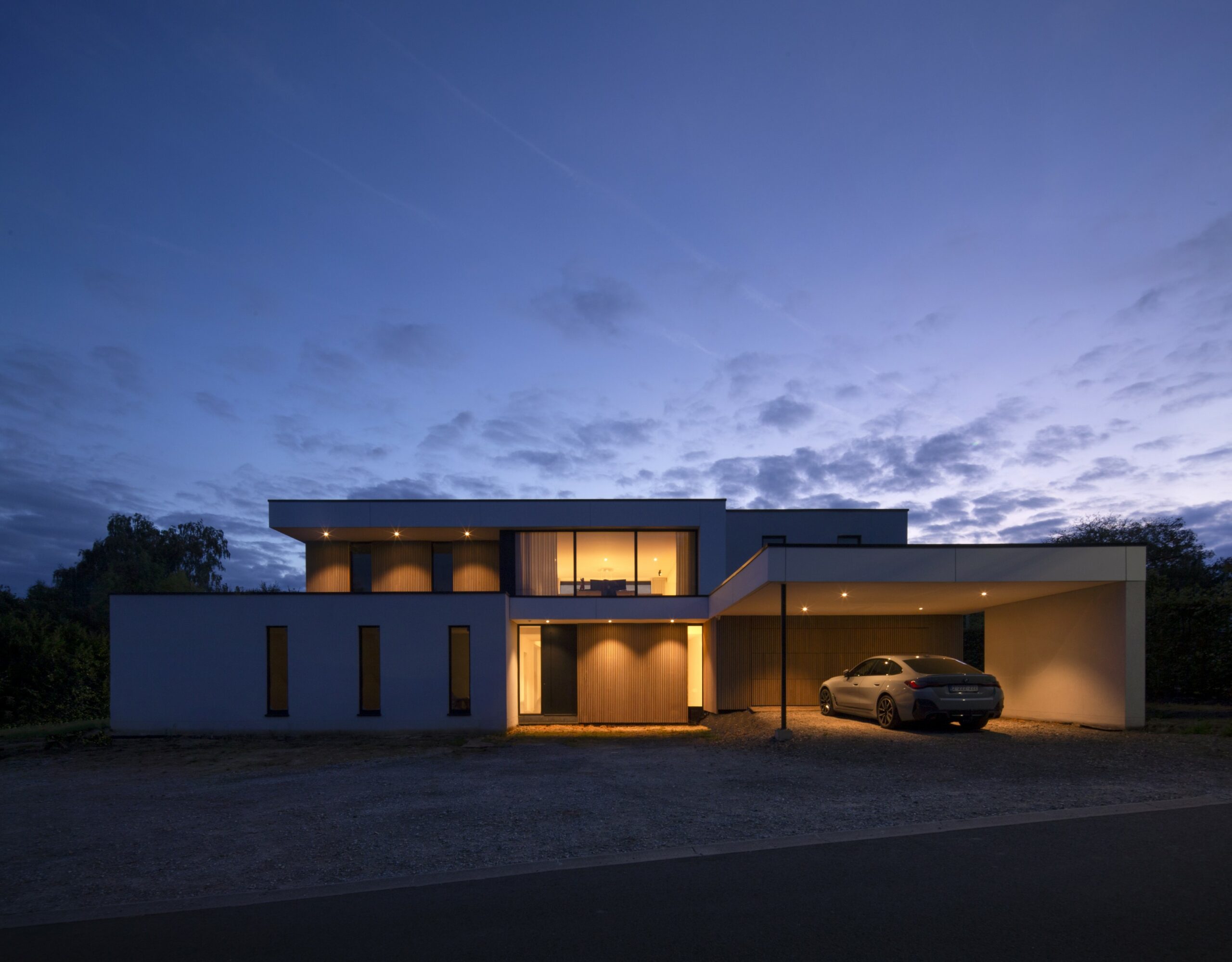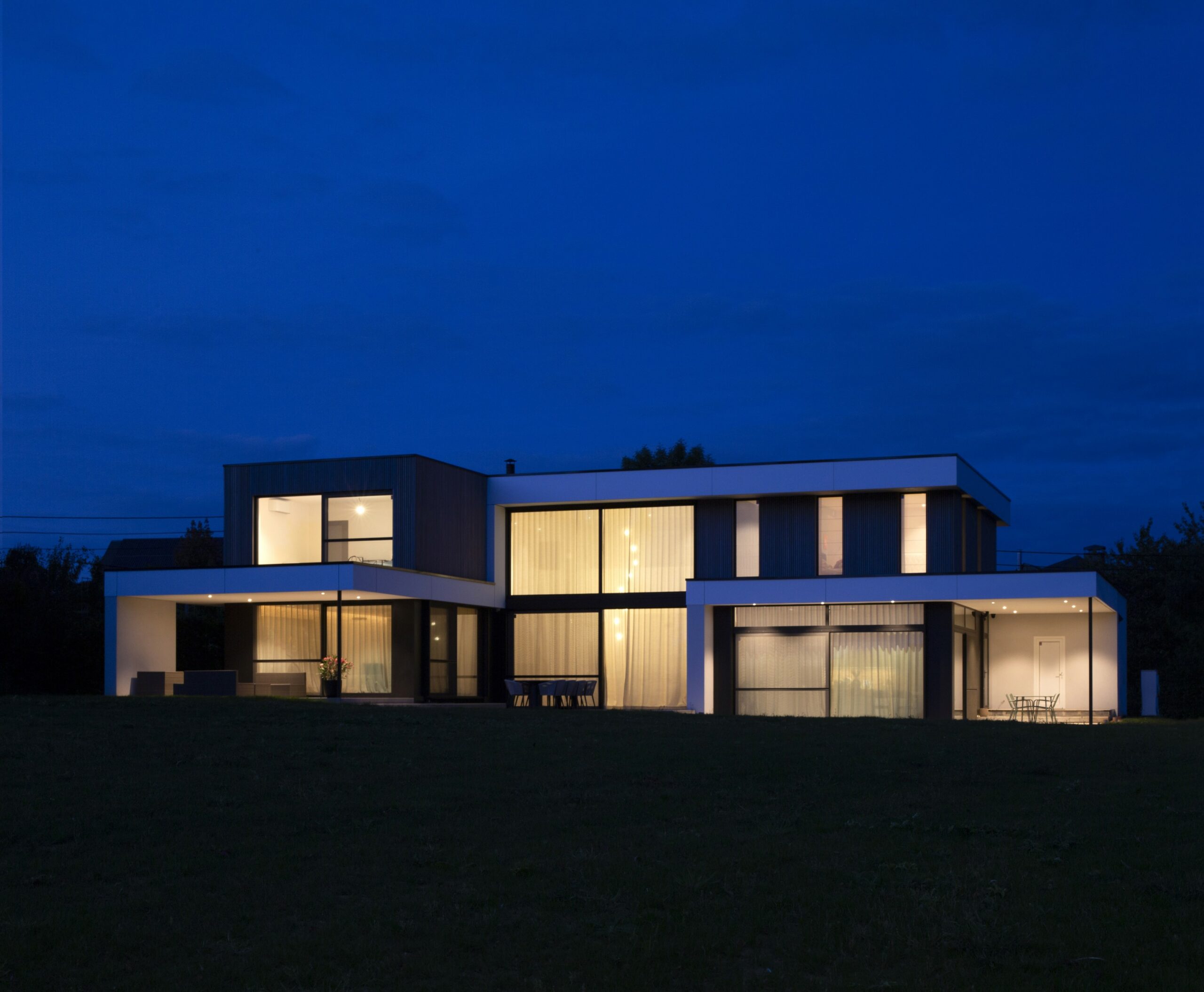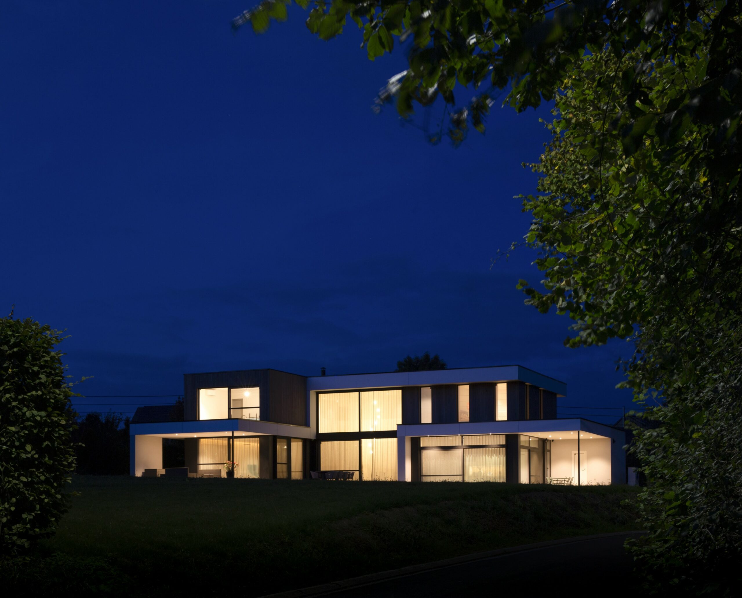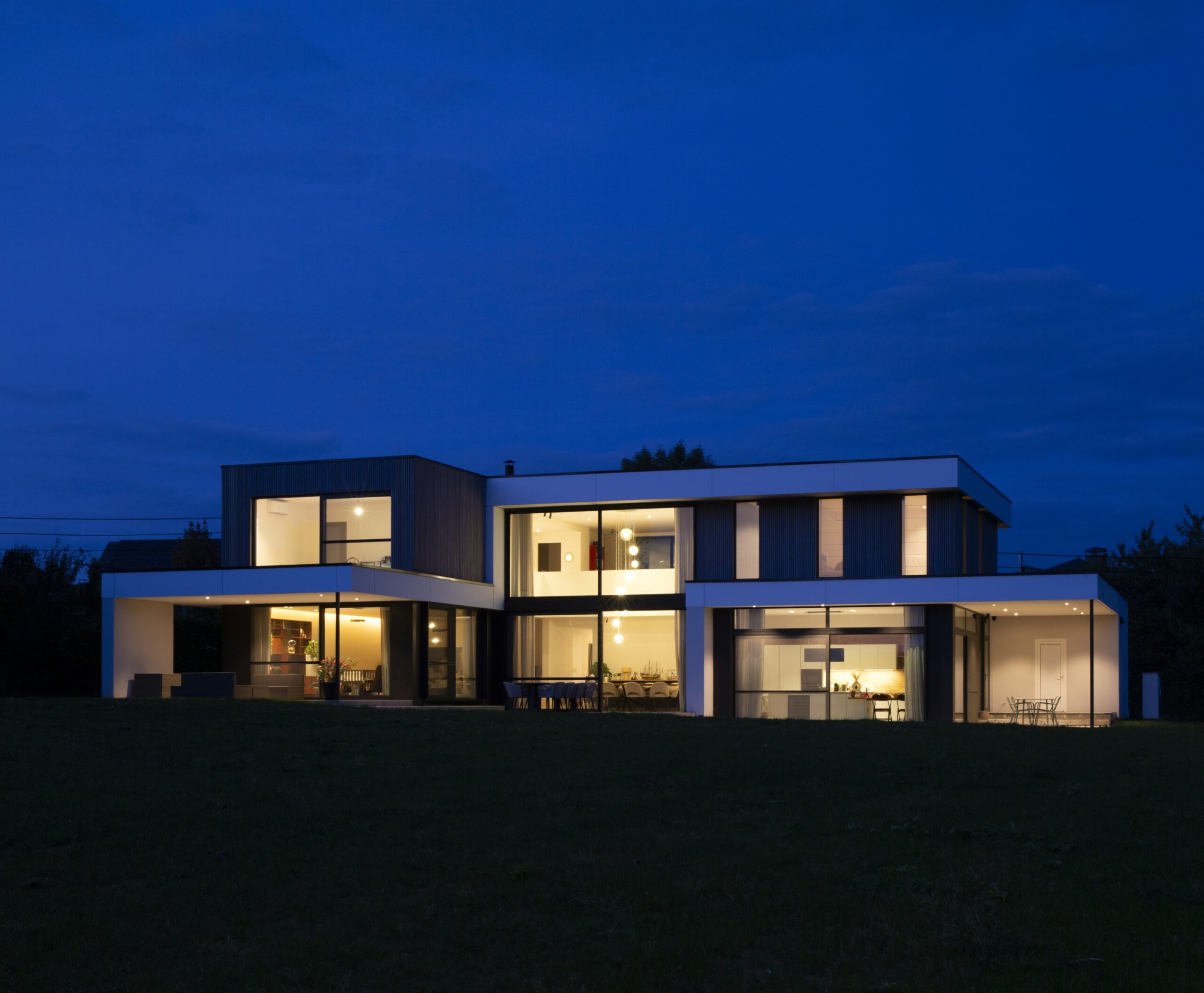 Ce projet s’implante sur une parcelle en légère pente à proximité du centre du village de Temploux. D’une superficie de près de 350m², cette habitation épouse au Rez-de-chaussée les courbes de niveaux par 3 paliers successifs. Un espace terrasse s’articule sur l’arrière du bâtiment laissant l’opportunité de profiter d’un ensoleillement est / Sud-ouest. Les débordement de toiture créent les terrasses couvertes et limitent les surchauffes. L’alliance entre plusieurs matériaux tels que crépis, aluminium et bois thermotraîté et le verre permet d’harmoniser les volumétries.