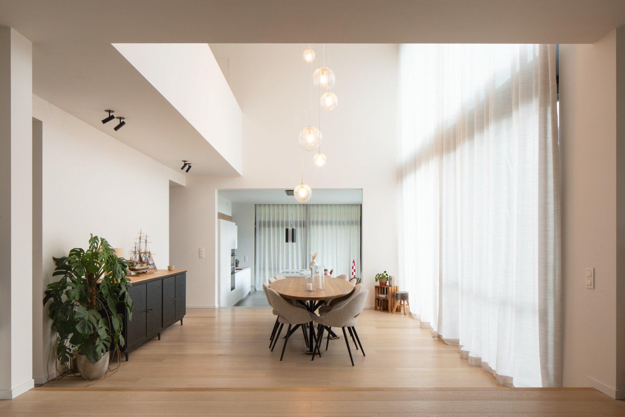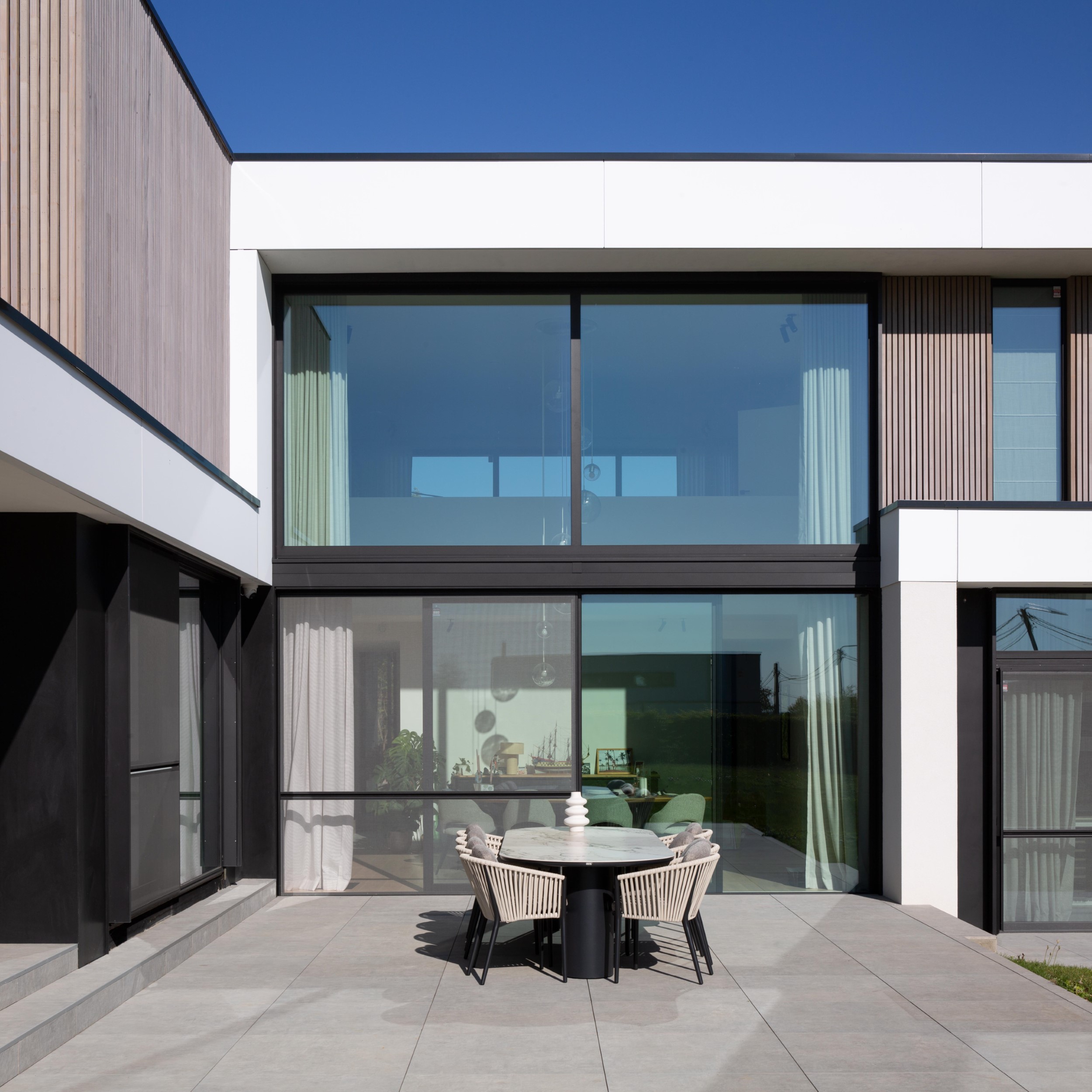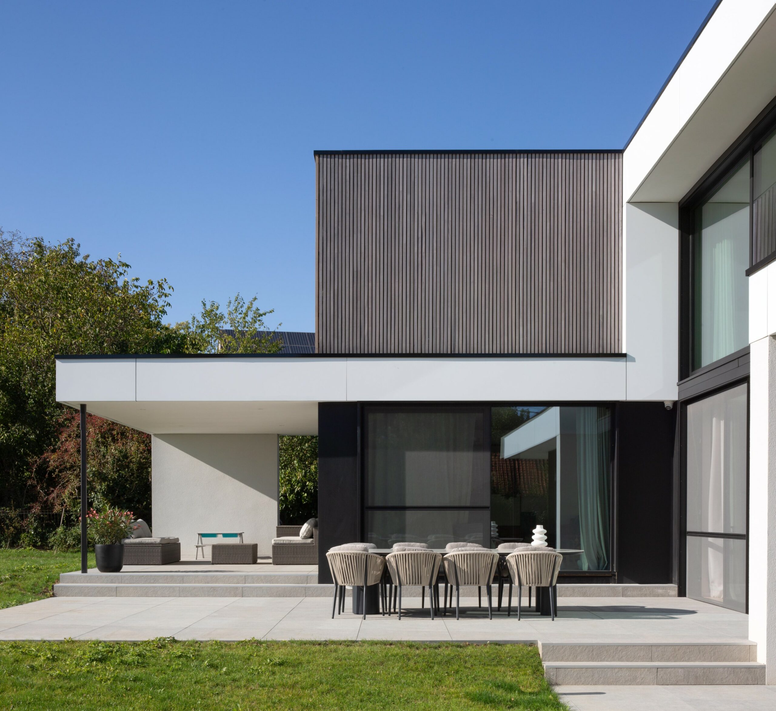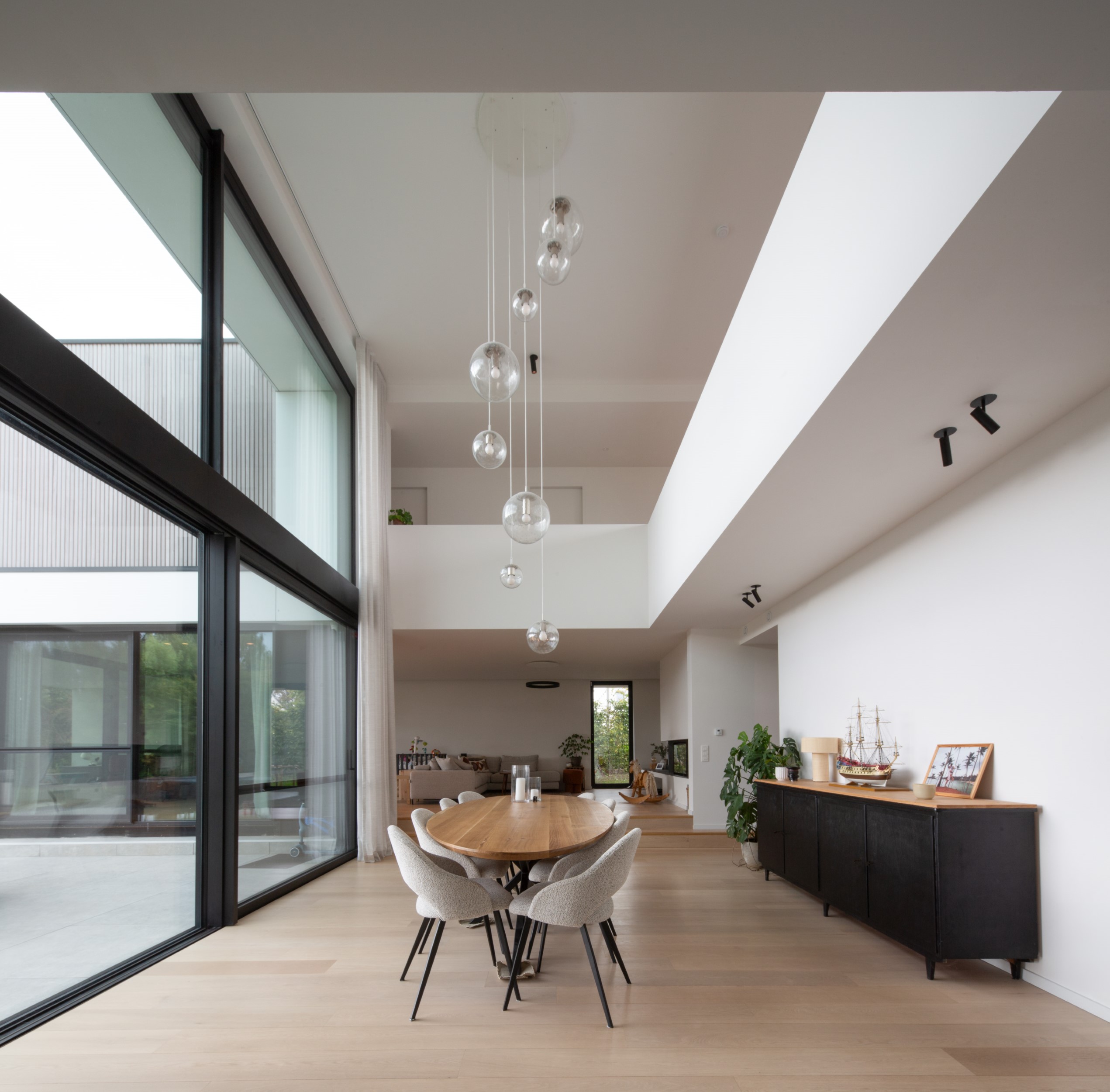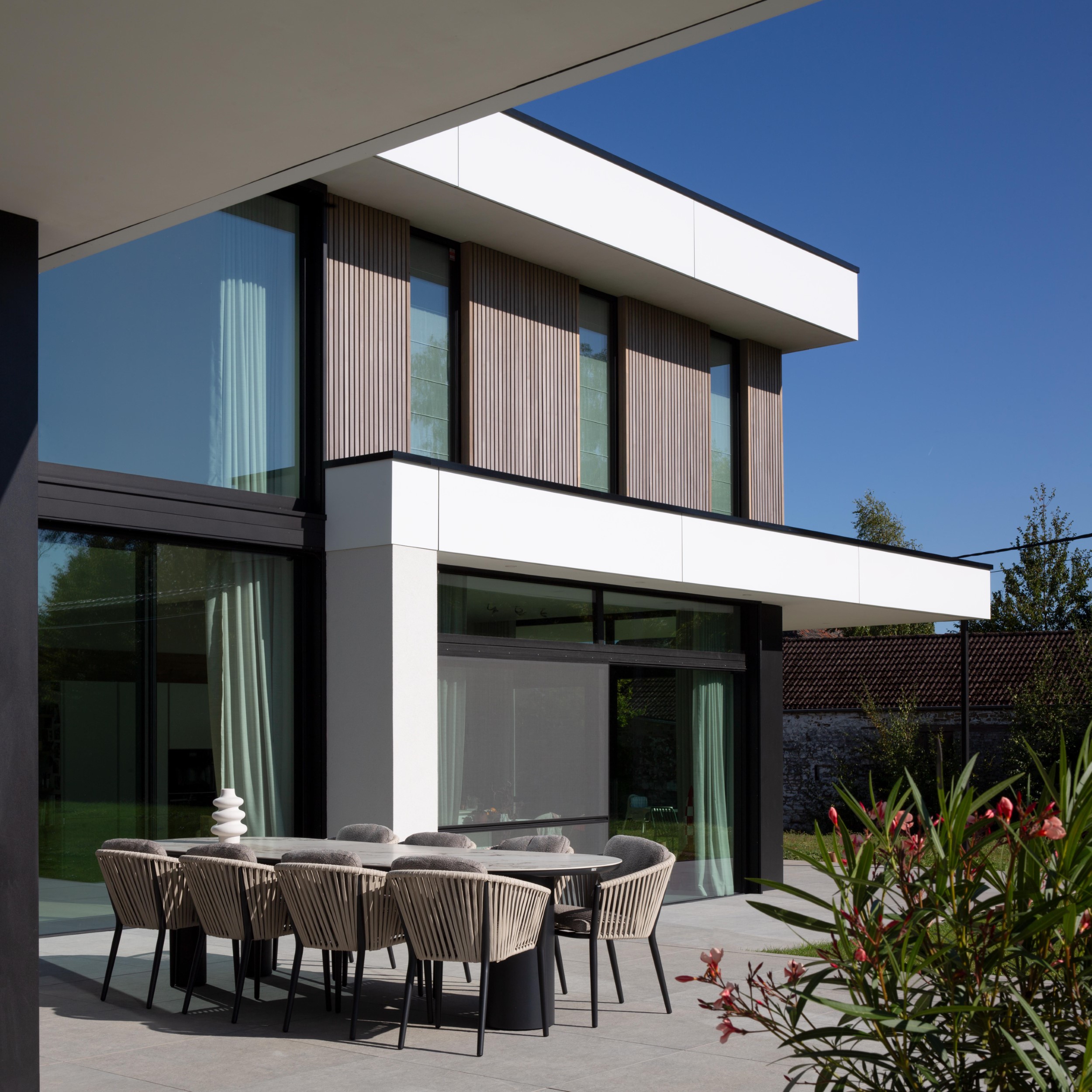 Ce projet s’implante sur une parcelle en légère pente à proximité du centre du village de Temploux. D’une superficie de près de 350m², cette habitation épouse au Rez-de-chaussée les courbes de niveaux par 3 paliers successifs. Un espace terrasse s’articule sur l’arrière du bâtiment laissant l’opportunité de profiter d’un ensoleillement est / Sud-ouest. Les débordement de toiture créent les terrasses couvertes et limitent les surchauffes. L’alliance entre plusieurs matériaux tels que crépis, aluminium et bois thermotraîté et le verre permet d’harmoniser les volumétries.