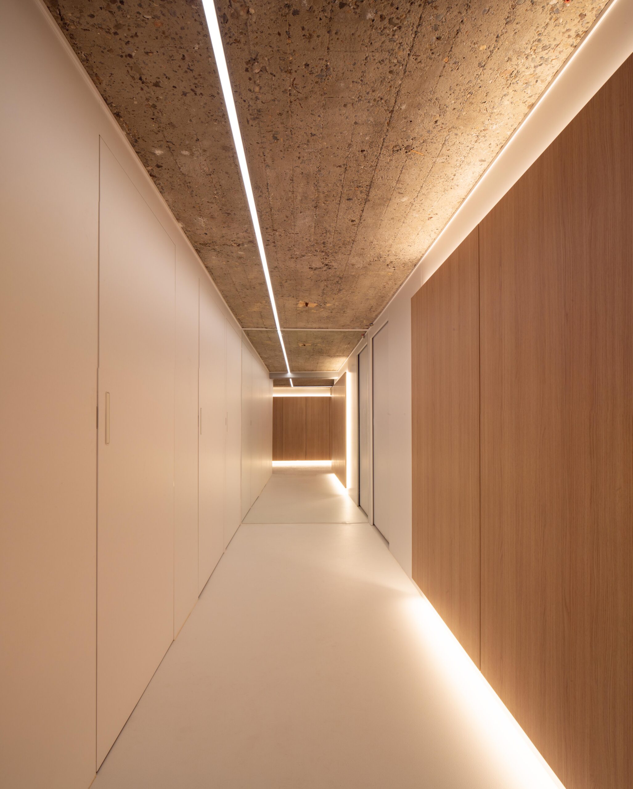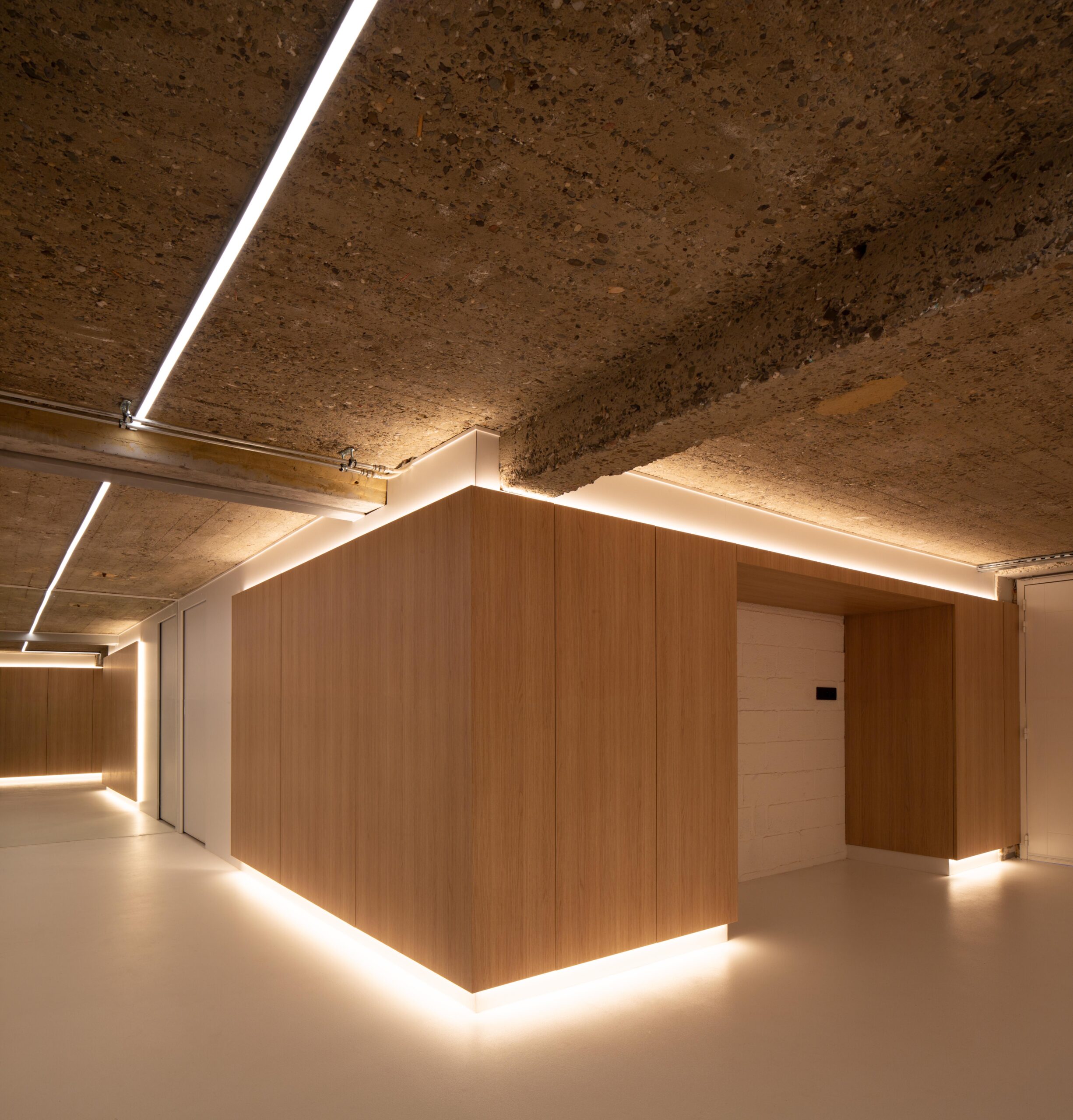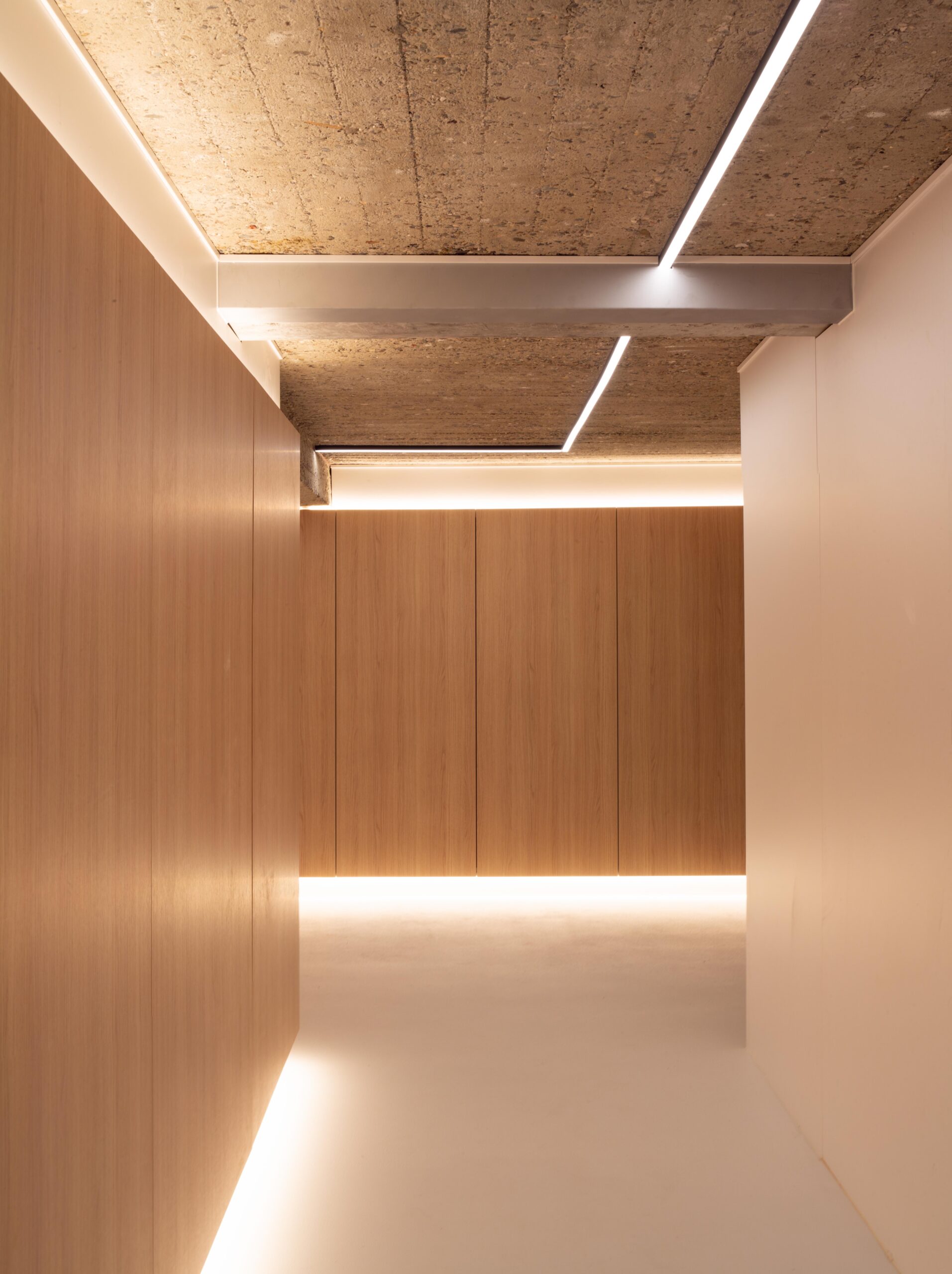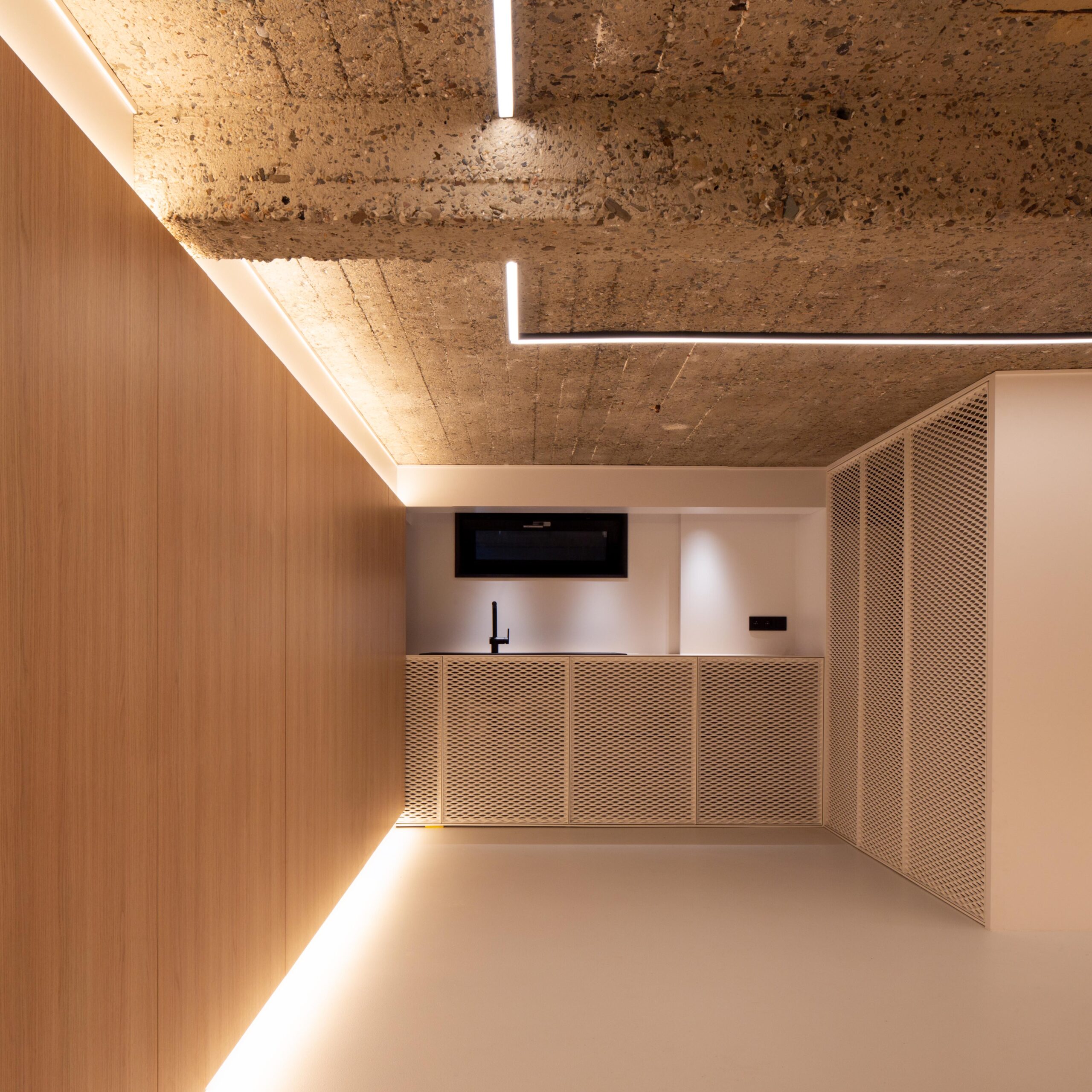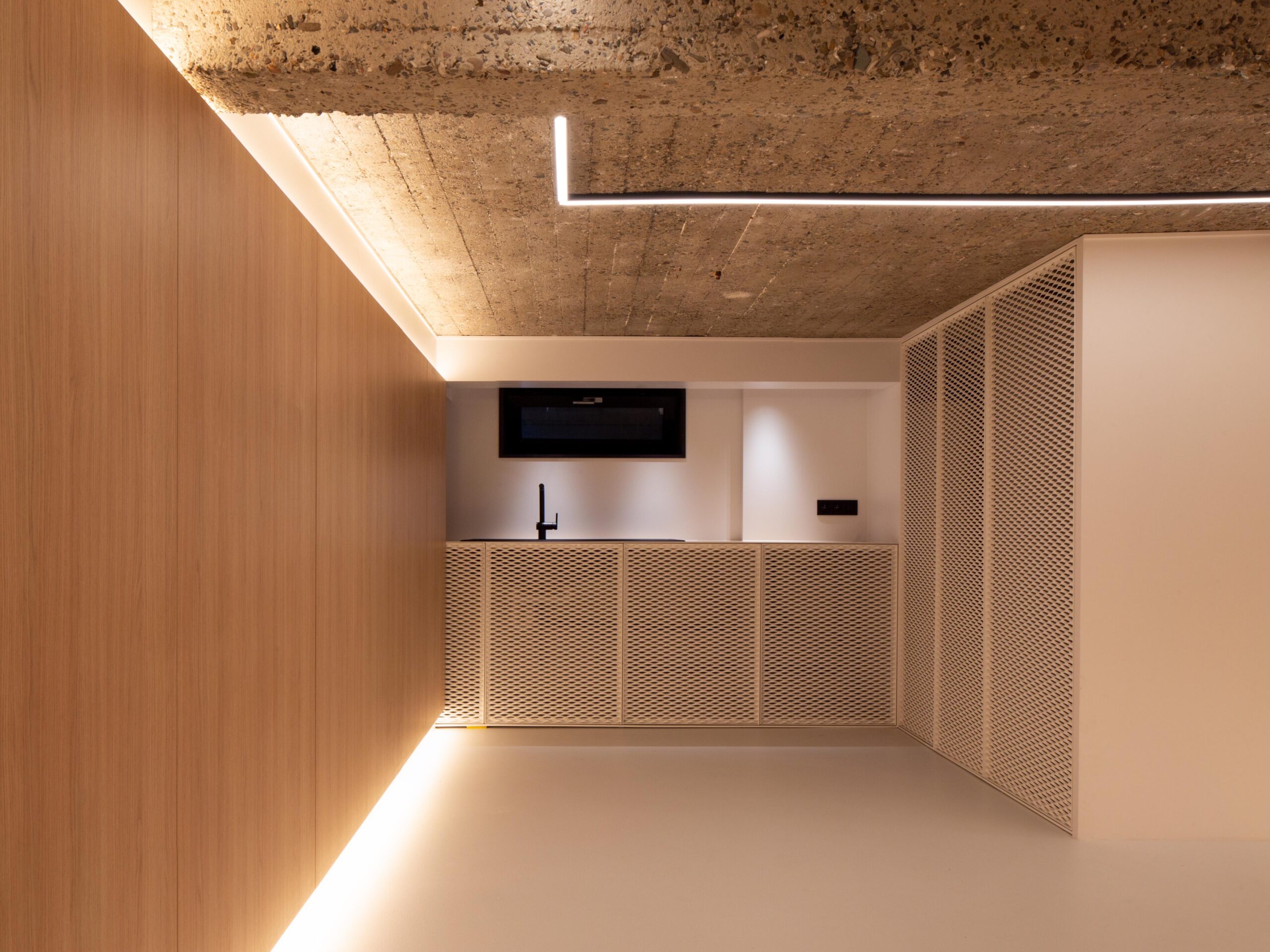 Pour répondre à cette demande, nous avons travaillé légèrement sur la structure, afin de mieux faire communiquer les espaces et agrandir leur perception. Le plafond a été sablé afin de retrouver l’aspect brut du béton, et créer un contraste avec le sol blanc et lisse en résine. Côté rangement, l’espace a été garni de plusieurs éléments de mobilier sur mesure en finition chêne naturel et/ou métal déployé laqué blanc/stratifié blanc. L’ensemble des éléments techniques (chaudière, tuyaux, décharges, tableaux électriques, cables) ont été soit déplacés, supprimés ou cachés dans les parties non utiles des meubles, afin d’épurer au maximum le visuel.