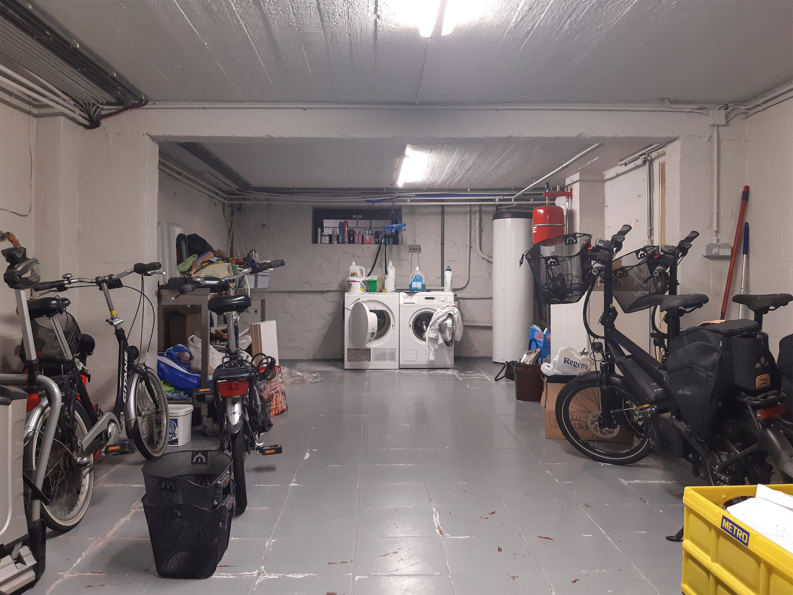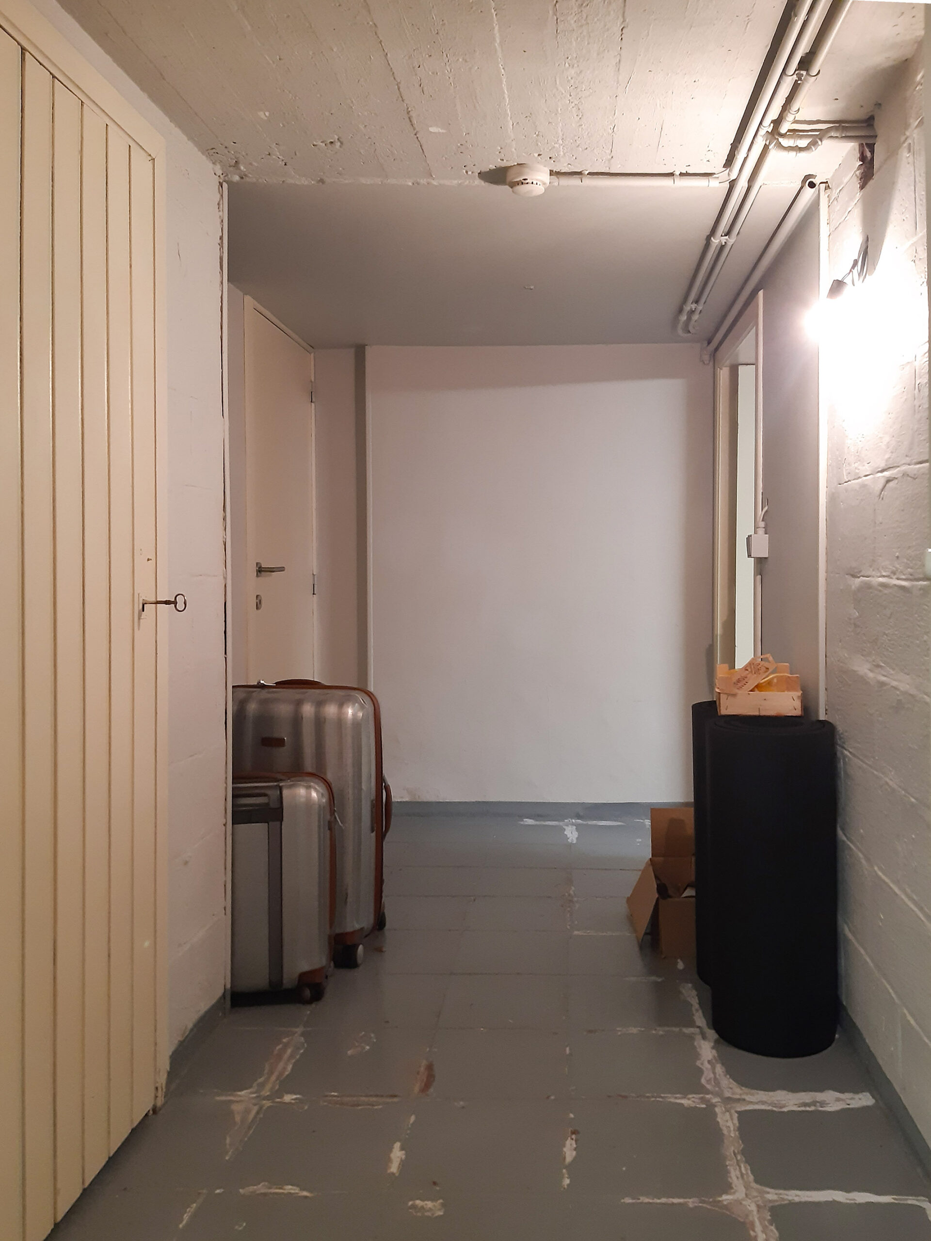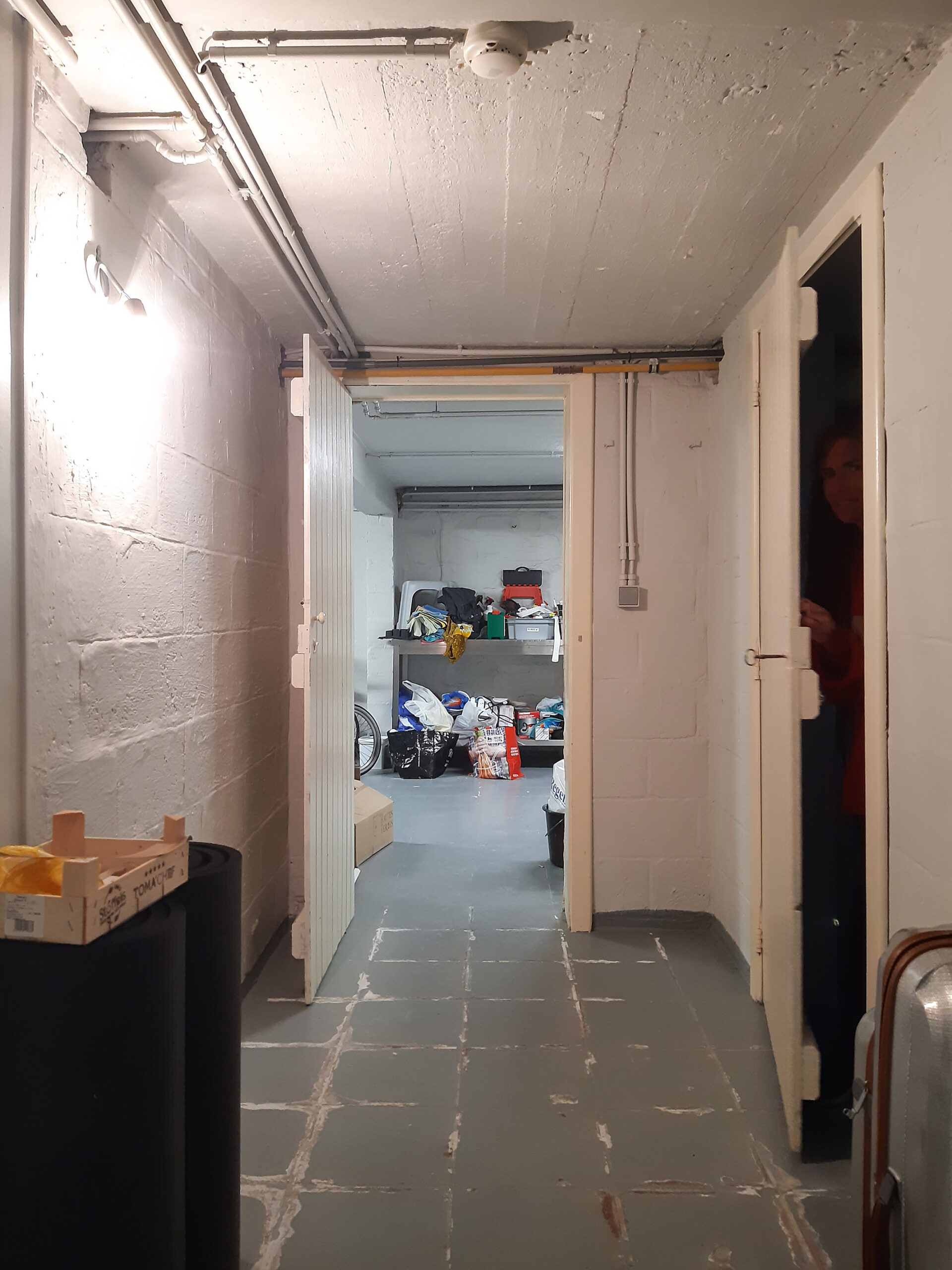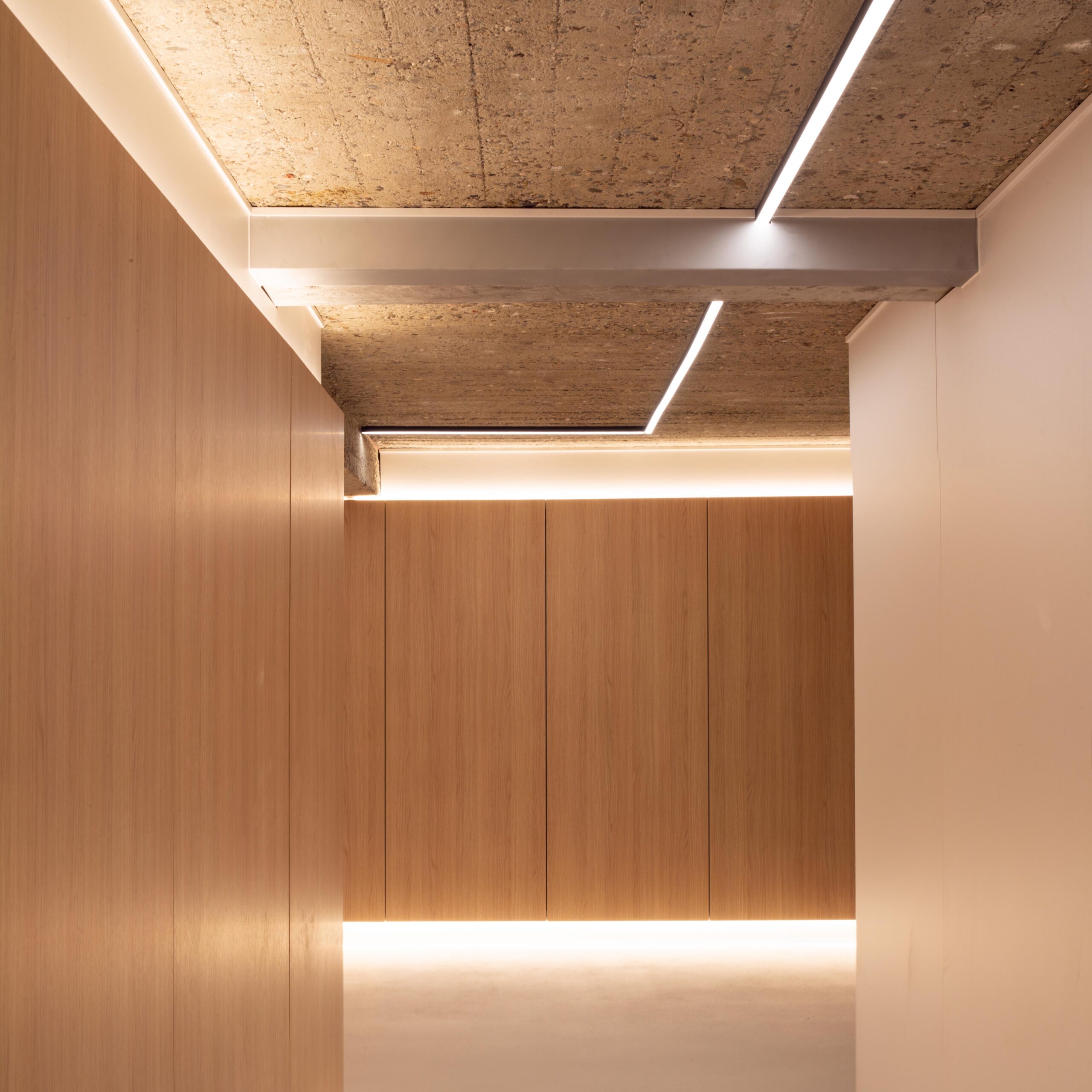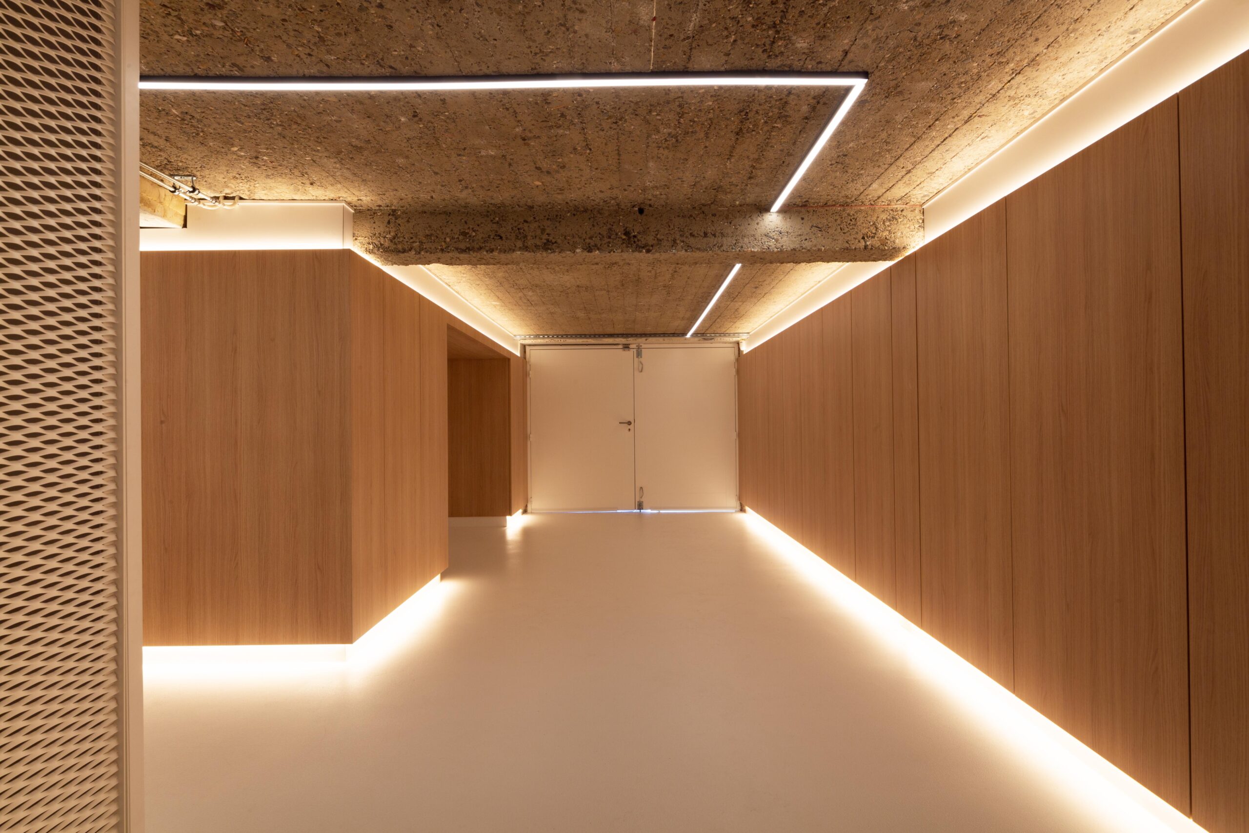 Pour répondre à cette demande, nous avons travaillé légèrement sur la structure, afin de mieux faire communiquer les espaces et agrandir leur perception. Le plafond a été sablé afin de retrouver l’aspect brut du béton, et créer un contraste avec le sol blanc et lisse en résine. Côté rangement, l’espace a été garni de plusieurs éléments de mobilier sur mesure en finition chêne naturel et/ou métal déployé laqué blanc/stratifié blanc. L’ensemble des éléments techniques (chaudière, tuyaux, décharges, tableaux électriques, cables) ont été soit déplacés, supprimés ou cachés dans les parties non utiles des meubles, afin d’épurer au maximum le visuel.