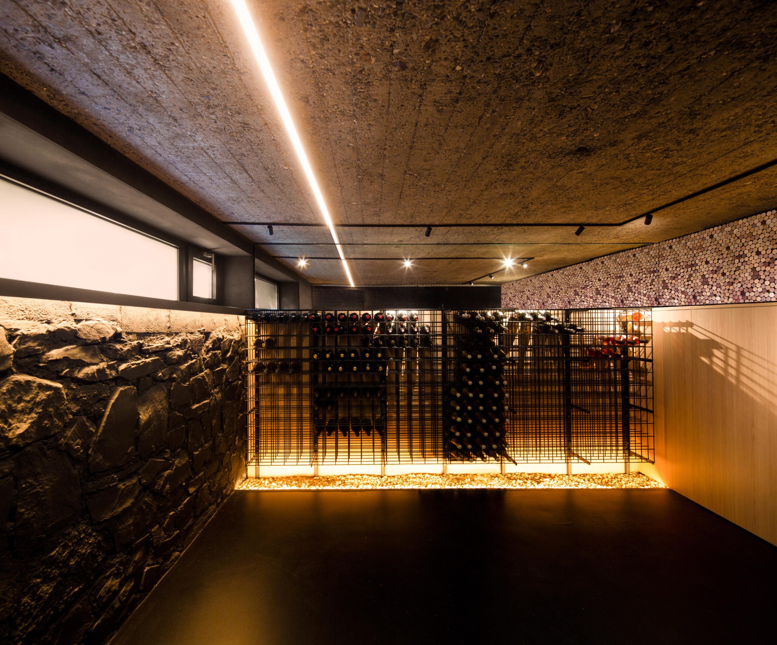 Pour la cave à vins, on passe du tout blanc au tout noir….Mais avec le même bois, jeu d’éclairage et un miroir pour donner plus de profondeur à la pièce.