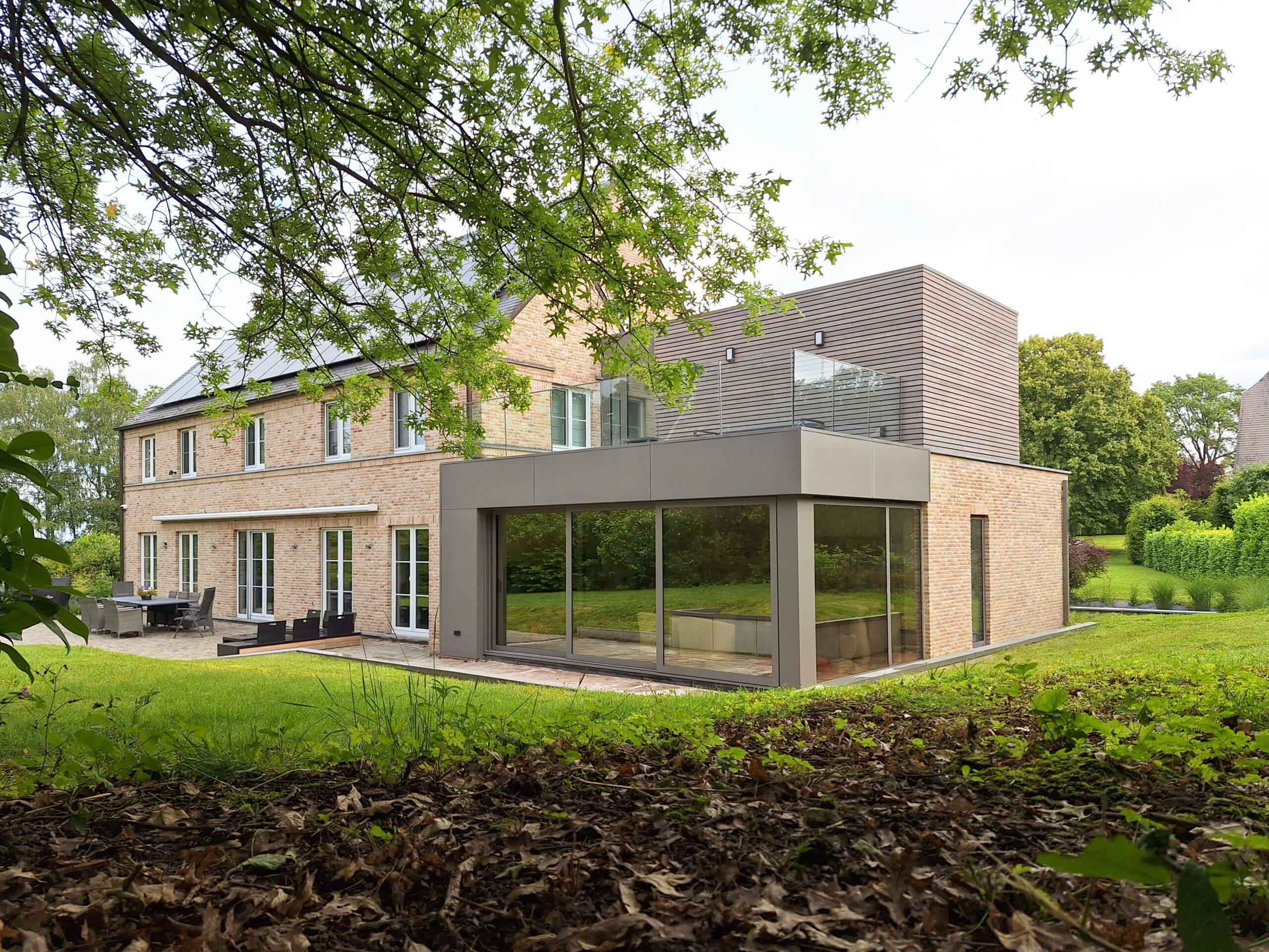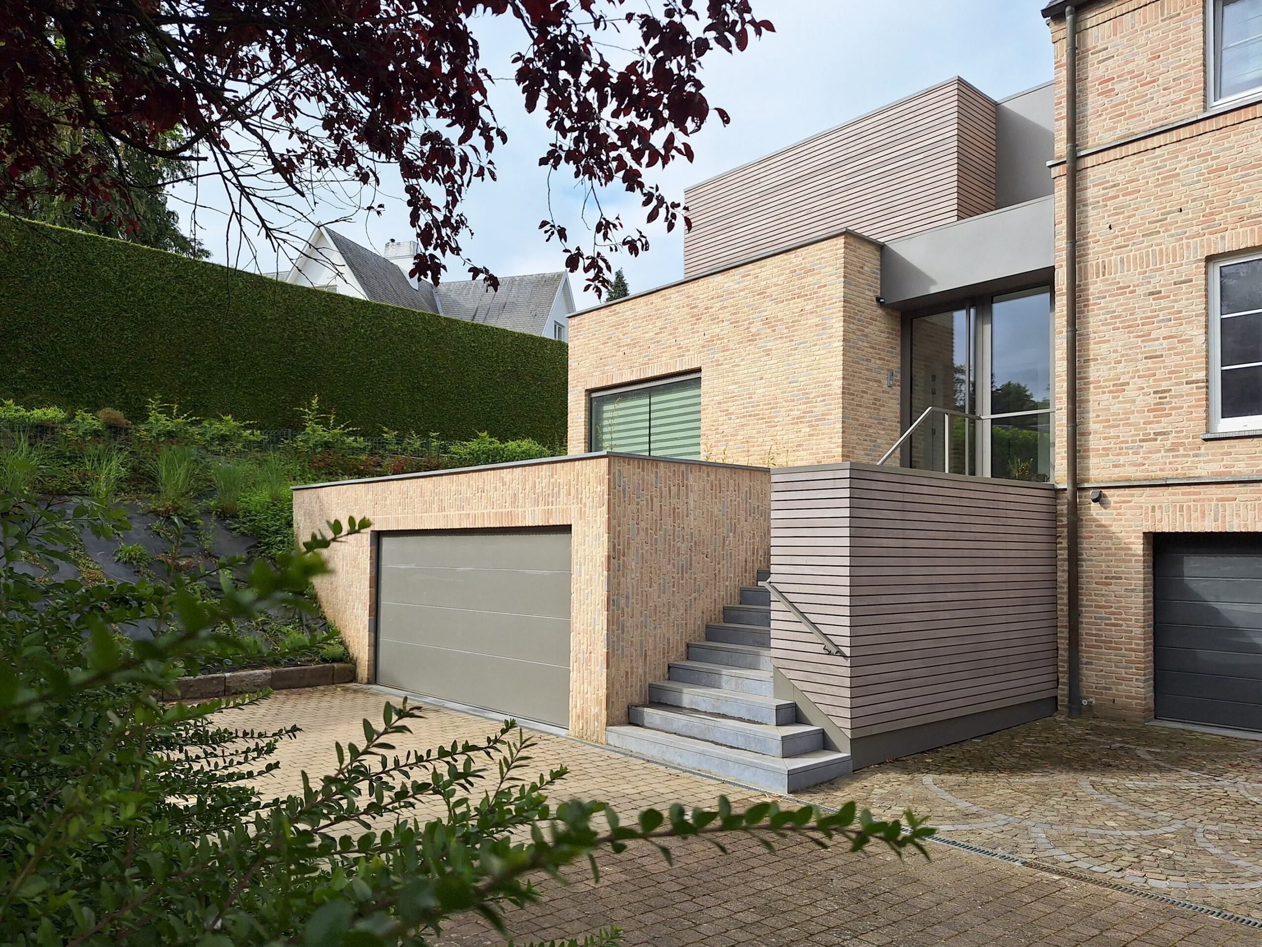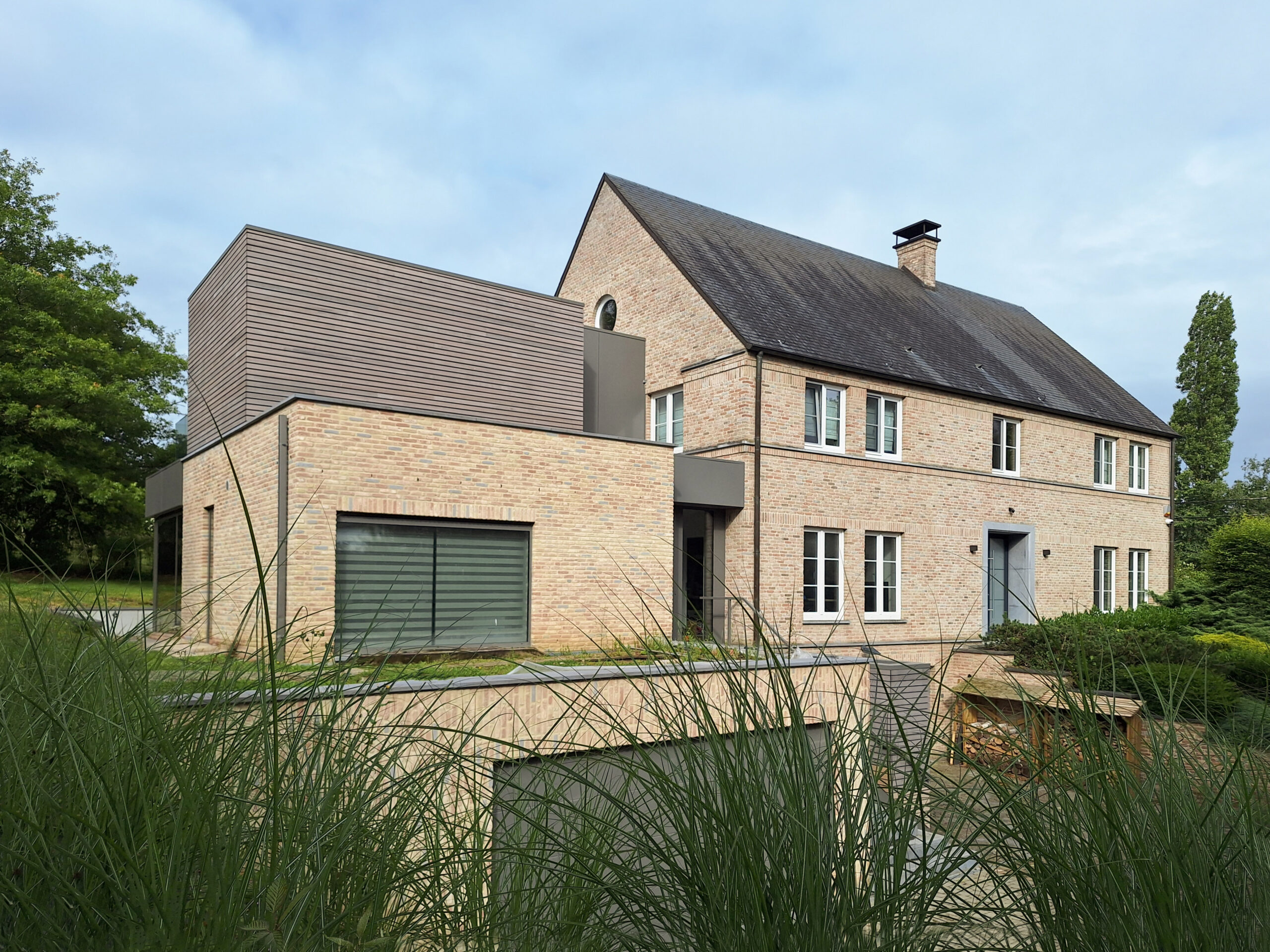 Le projet se situe sur une parcelle sur les hauteurs de Namur dans le quartier de la Citadelle. La maison existante a été bâtie dans les années 90 et affiche un style traditionnel. Le programme consiste en une Extension professionnelle et privée sur trois niveaux. Pour ce projet, nous avons proposé de reprendre la brique originelle afin de dialoguer avec la partie existante, dans un esprit plus contemporain et un jeu de volumétries différent. Cette brique, tantôt appareillée en pose verticale ou horizontale, se marie avec des matériaux plus lisses ou plus rythmés comme l’aluminium ou la bois ajouré prépatiné.