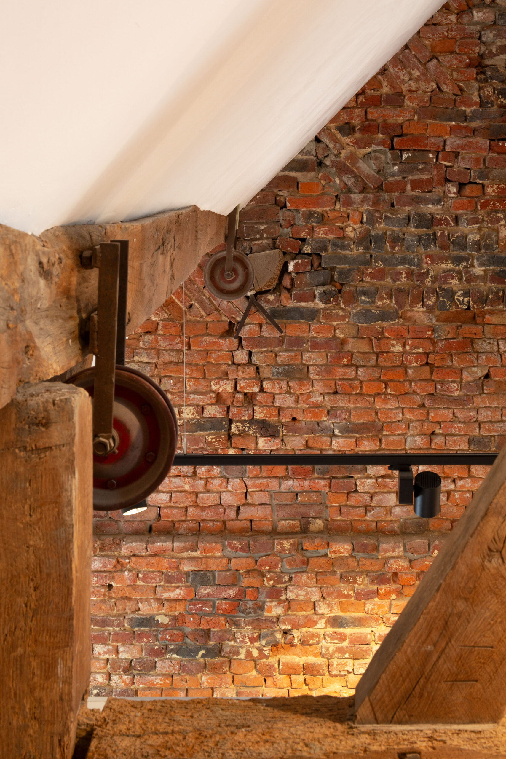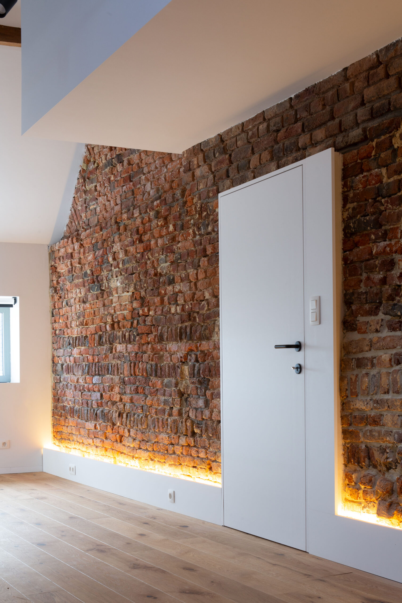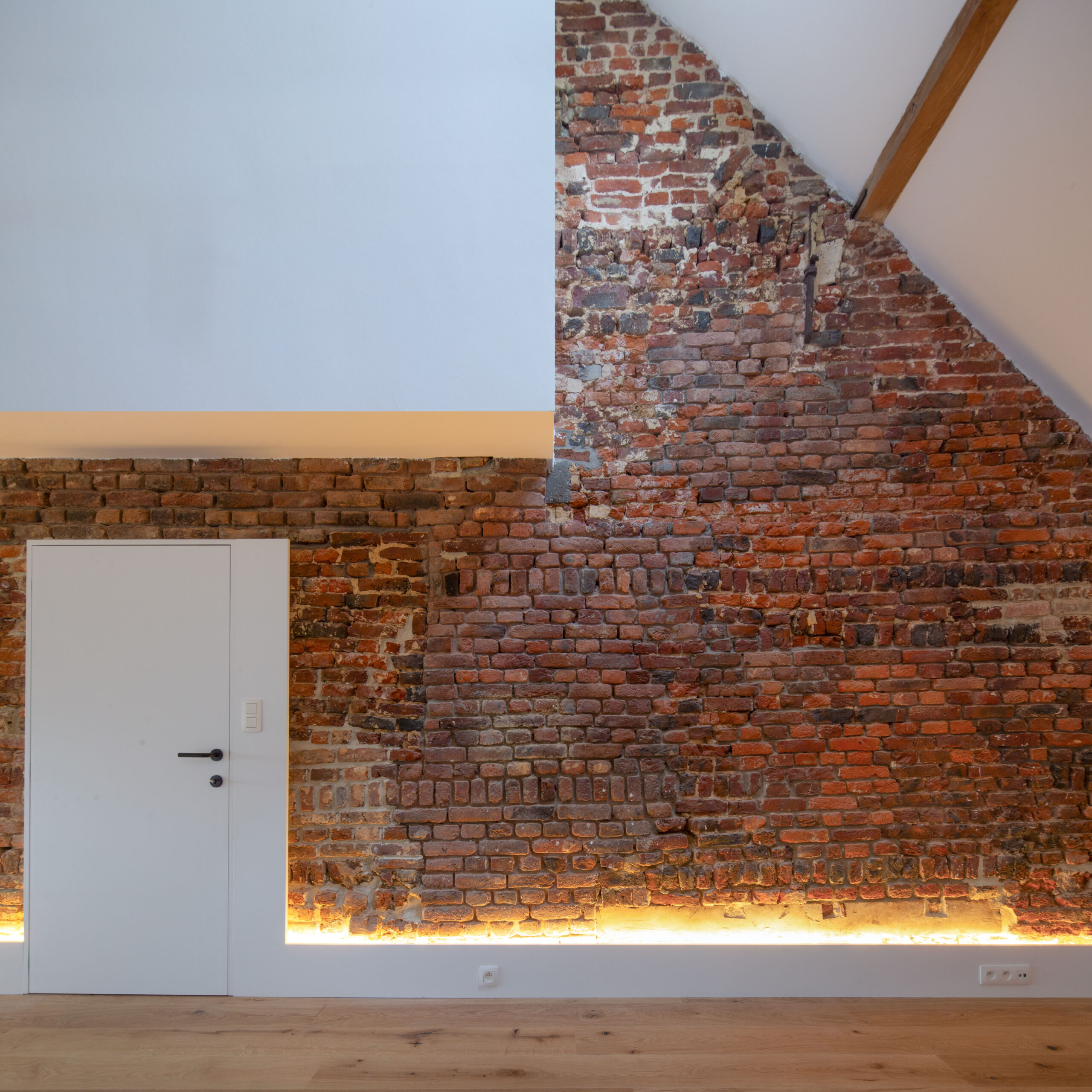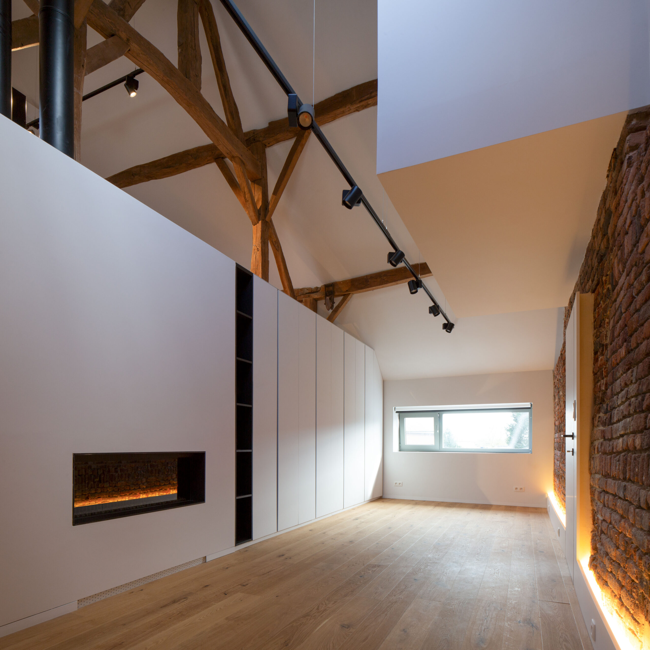 Le souhait des propriétaires est l’aménagement d’un espace parental sur deux niveaux, comprenant chambre, salle-de-bain, dressing, petit salon avec feu et espace créatif « libre » + un petit espace de travail isolé. A cela s’ajoute la réorganisation des chambres plus spacieuses pour trois enfants, et une salle de douche supplémentaire. Dans ce projet, nous avons travaillé sur la mise en valeur du mur en brique et de la charpente, et réfléchi à la création d’un espace ouvert à la fois chaleureux et fonctionnel.