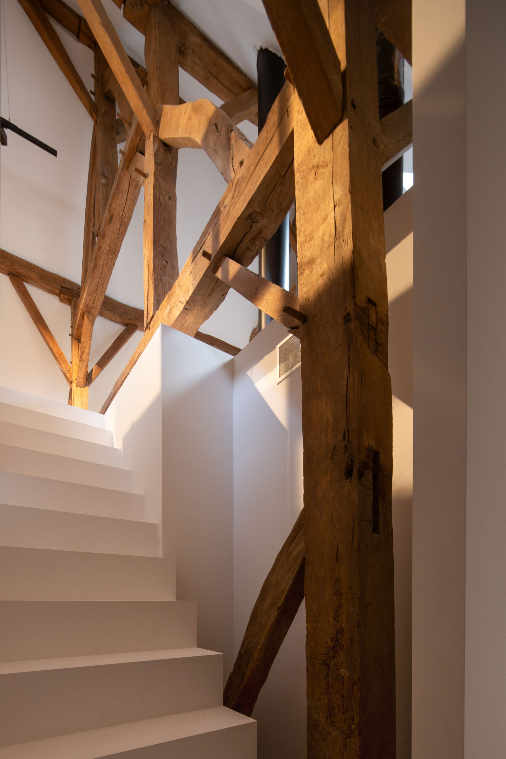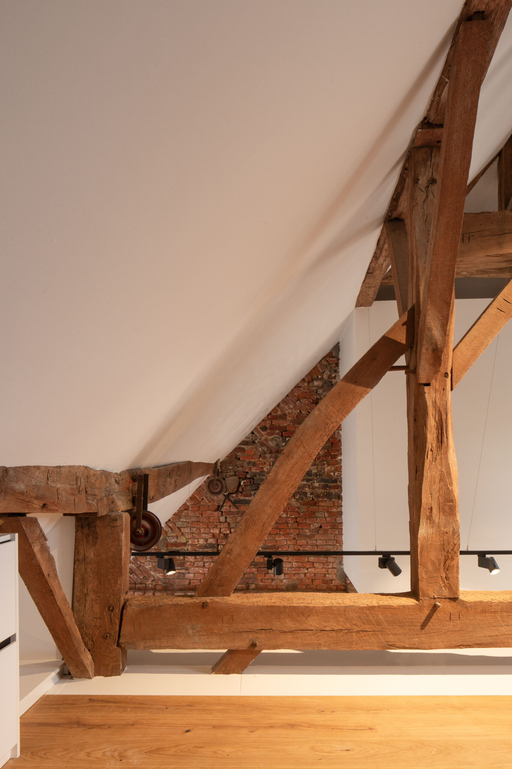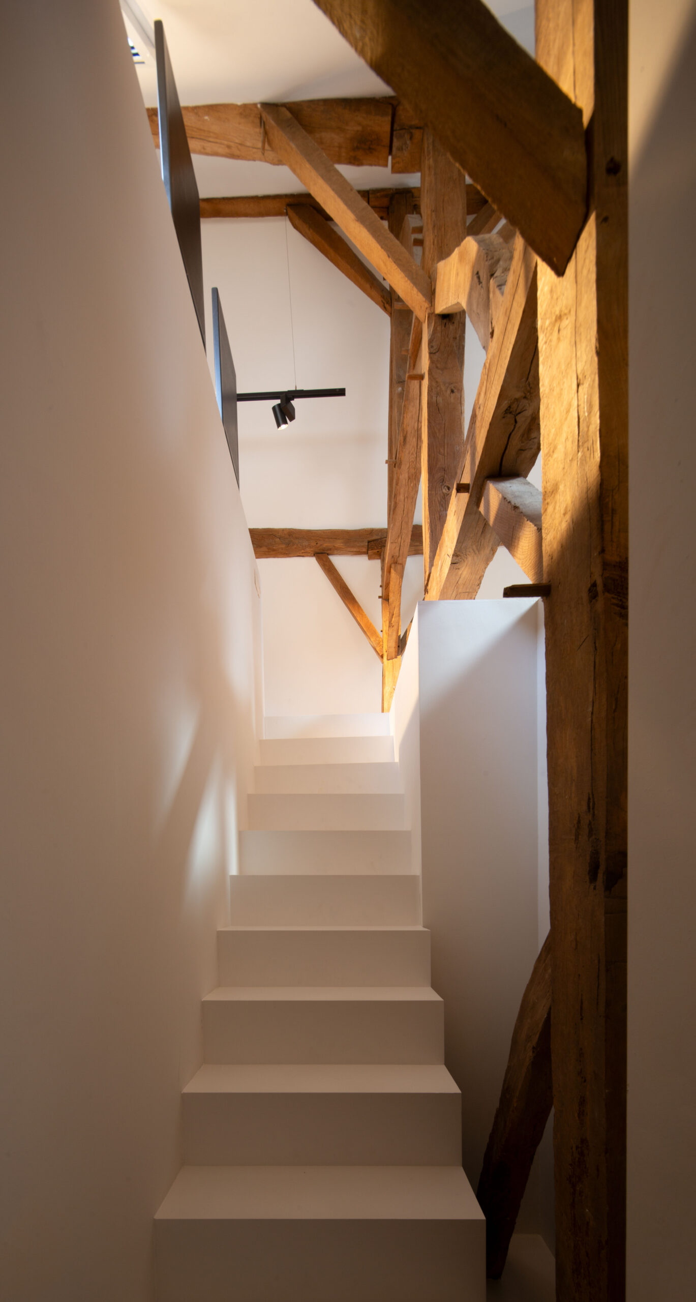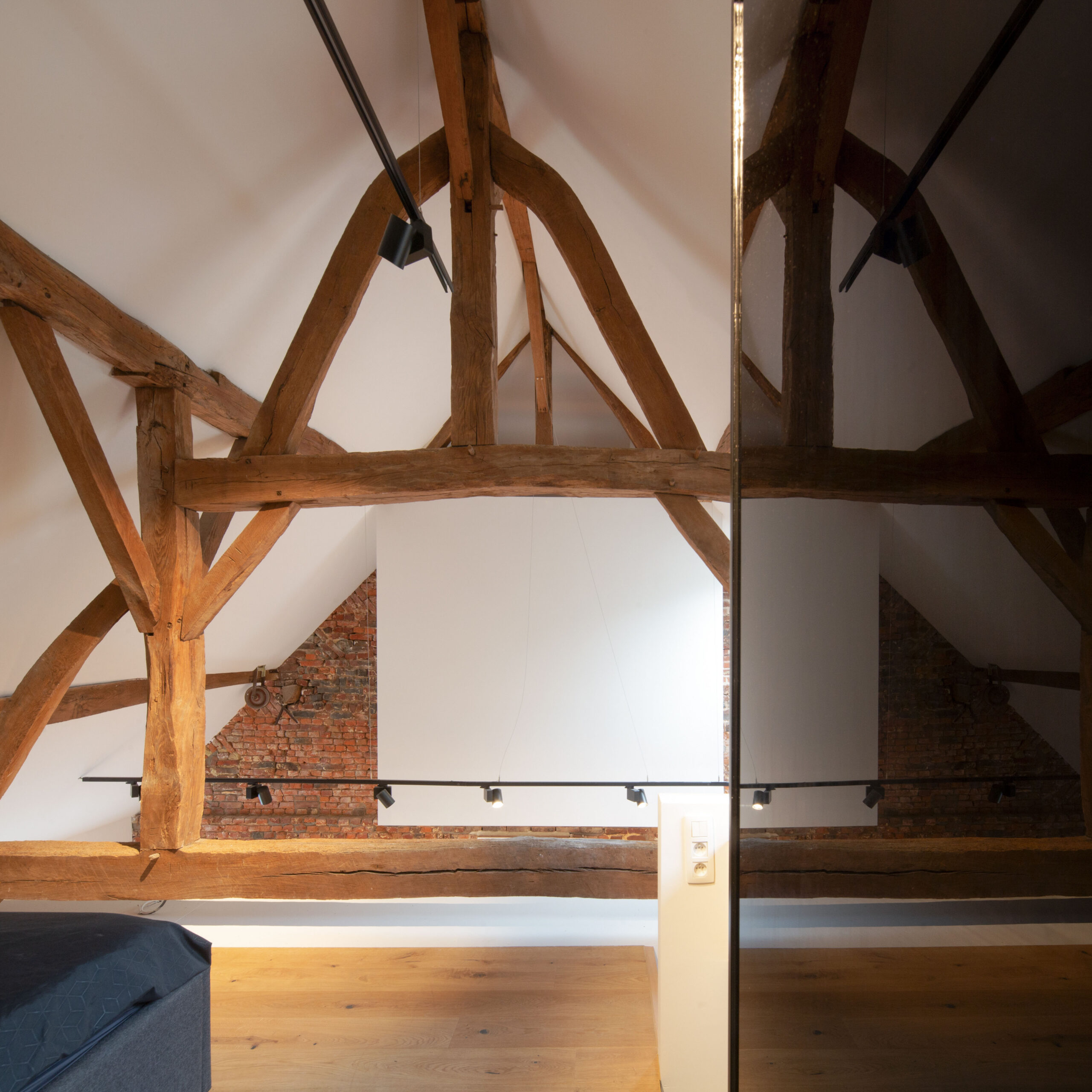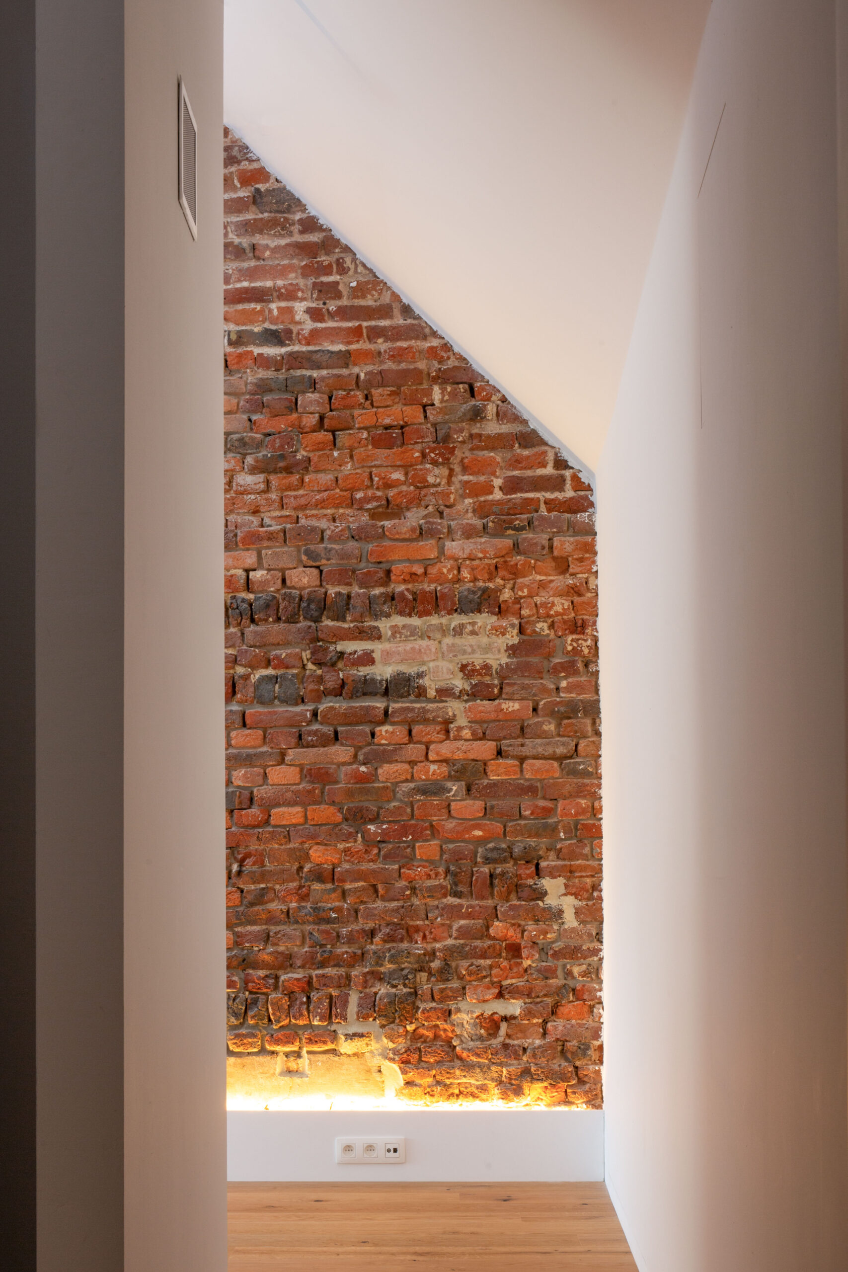 Le souhait des propriétaires est l’aménagement d’un espace parental sur deux niveaux, comprenant chambre, salle-de-bain, dressing, petit salon avec feu et espace créatif « libre » + un petit espace de travail isolé. A cela s’ajoute la réorganisation des chambres plus spacieuses pour trois enfants, et une salle de douche supplémentaire. Dans ce projet, nous avons travaillé sur la mise en valeur du mur en brique et de la charpente, et réfléchi à la création d’un espace ouvert à la fois chaleureux et fonctionnel.