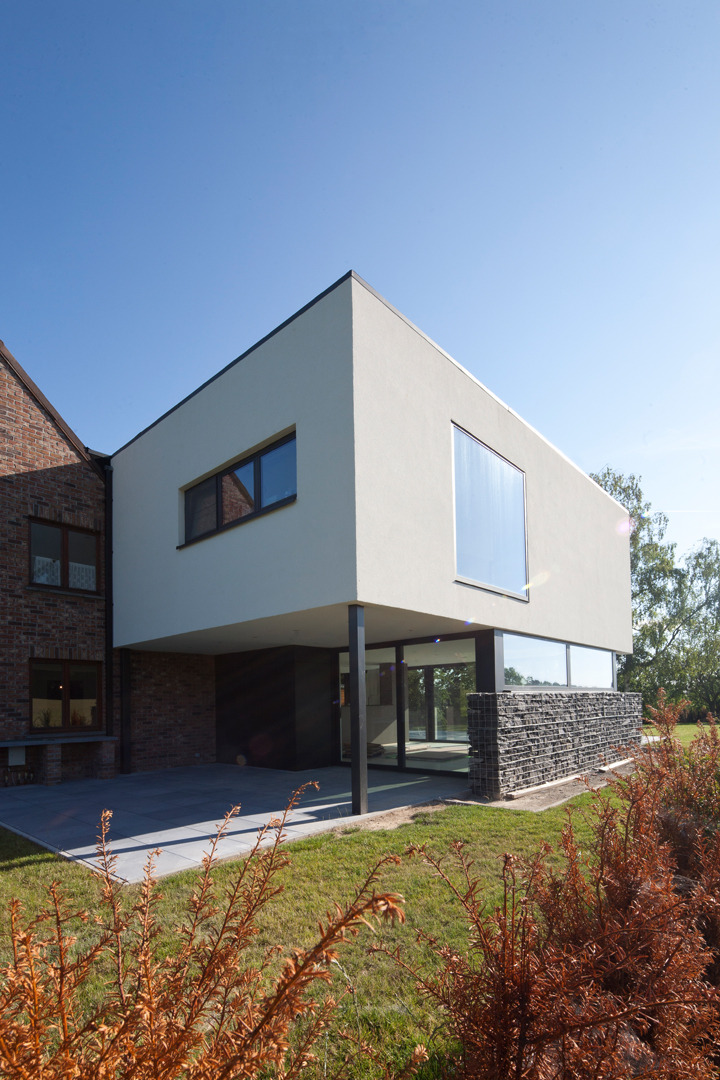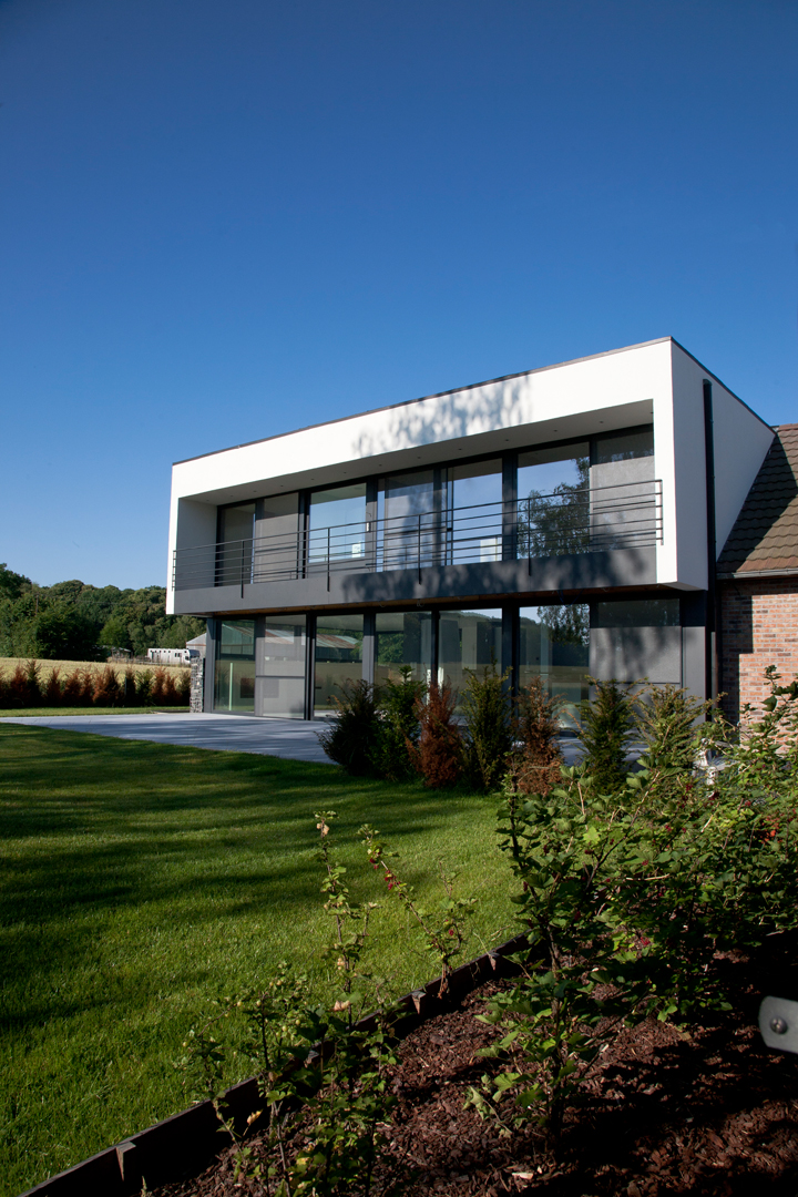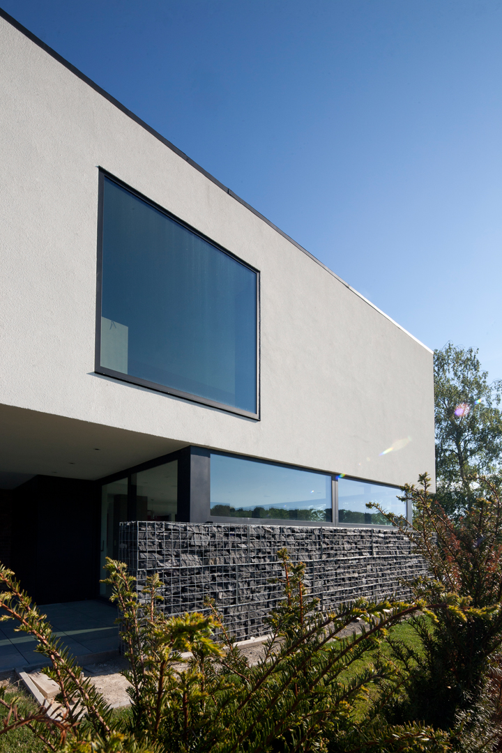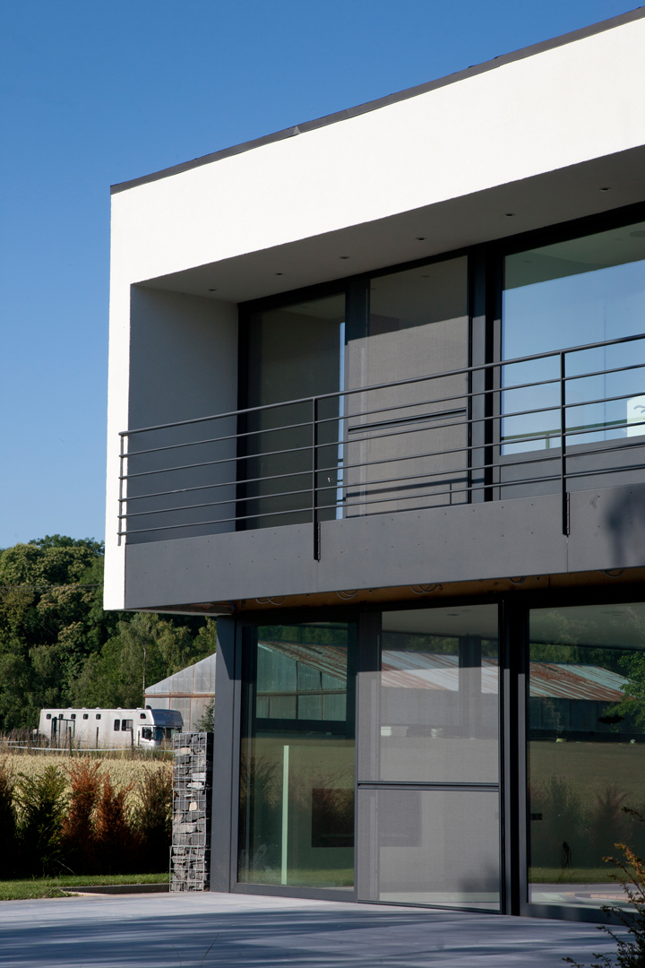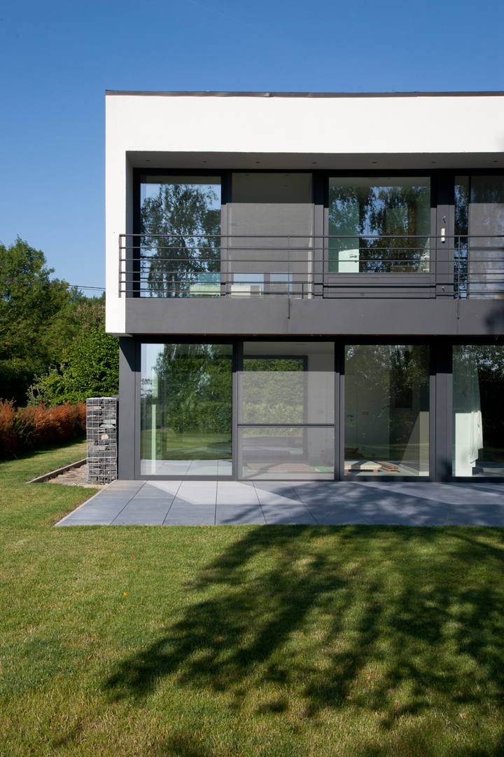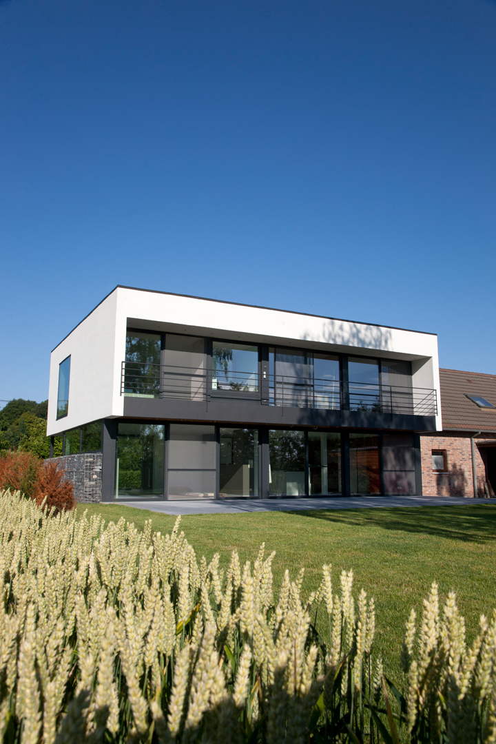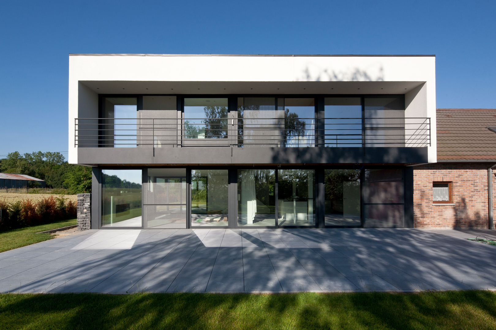 Le choix s’est orienté vers un contraste très prononcé, tant au point de vue de la volumétrie que des matériaux mis en œuvres. Le soleil tourne autour des pièces de vie au gré des heures, et les deux terrasses permettent de profiter pleinement des espaces extérieurs.